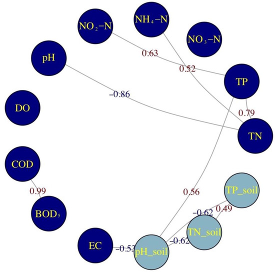 Pearson correlation analysis was conducted to explore the relationships among water quality parameters (Figure 4). TN and TP had a strong correlation (r = 0.79, p < 0.001) as well as COD and BOD5 (r = 0.99, p < 0.001). Moderately positive correlations were observed between TN and NH4+-N (r = 0.52, p < 0.05). The relationship between TP and NO2−-N (r = 0.629, p < 0.05) suggested a connection between total P and NO2−-N. Significantly negative correlations were found between TN and pH. Elevated TN levels may lead to processes like nitrification, which lowers pH, suggesting interactions between nutrient levels and acidification, possibly due to nitrification releasing hydrogen ions [51,52]. Higher P levels in water significantly correlate with pH (r = 0.56) in soil. The relationship of TN and TP in soil (r = 0.49) indicates that TN and TP in soil likely share similar sources or accumulation patterns. The correlations highlight the interconnectedness of N and P cycles, both in water and soil. Significant correlation between the TN and TP in soil suggests co-occurrence of nutrients in terrestrial environments, which can influence nutrient leaching into aquatic systems.