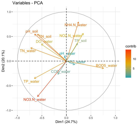 Contributions of variables to principal components (NO3.N: NO3−-N; NO2.N: NO2−-N; NH4.N: NH4+-N; *_water: data measured in water; *_soil: data measured in soil).
