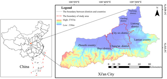 Xi’an is situated at the Guanzhong Plain in the middle of Yellow River Basin, a semi-arid area of northwest China [3]. The study area (Figure 1) covers the urban area of Xi’an, including Baqiao, Beilin, Lianhu, Weiyang, Yanta, and Xincheng districts. The boundaries are delineated by Dongsanyao Village to the south, the Wei River to the north, the Feng River to the west, and the Ba River water source to the east, spanning an approximate area of 940 km2 [19].