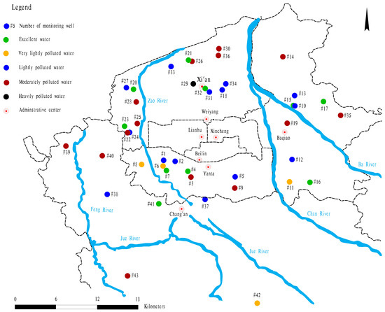 Samples #6, #8, #11 and #42 were rated as VL (very lightly polluted), accounting for 9.3% of the confined water samples, mostly located in the southern region of Xi’an.
