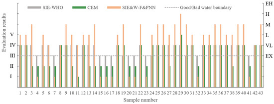 The evaluation results of various methods, as presented in Table 6 and Table S1, indicate that the SIE-GB, SIE-WHO and CEM methods were more stringent than the WQI with three different weights. There were many bad water samples in the evaluation results, among which SIE-WHO had the highest number of bad water samples (30, 69.77%). The number of bad water samples obtained using the SIE-GB and CEM methods was the same (24, 55.81%), but the bad water samples of SIE-WHO did not entirely overlap with samples from SIE-GB and CEM. For instance, samples #19, #24 and #30 were rated as bad water based on SIE-GB and CEM but were rated as good water by SIE-WHO. Furthermore, when considering both the WHO’s desirable limits [16] and the TVs of Grade III [15], the SIE results had the highest number of bad water samples (33, 76.74%) (SIE&W-F&PNN).