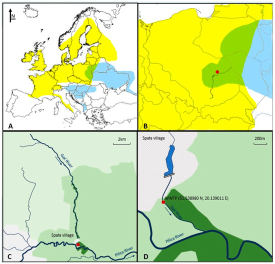 Occurrence of the Ukrainian brook lamprey (blue) and European brook lamprey (yellow) and areas of their overlapping habitat (green) in Europe (A) and Poland (B). The study area, the River Gać with a WWTP (wastewater treatment plant) (red dot) (C,D).