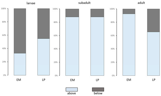Proportions of the Ukrainian brook lamprey (EM) and European brook lamprey (LP) larvae, subadults, and adults caught in the unpolluted (above) and polluted (below) sections of the River Gać.