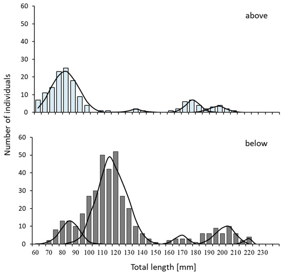 The growth of the lampreys was assessed based on length–frequency analysis. Size classes were presumed to represent annual age classes identified in seasonal length–frequency samples using the method of Bhattacharya (1967), separating partial normal distributions characterized by mean values and standard deviations. This method is particularly reliable with one-batch spawners and does not require post-mortem collection of statoliths. Modal class progression analysis was conducted with a minimum class separation index of 2. The decomposition of the frequency diagrams was performed using the FiSAT II (1.2.0.2.) package (ELEFANT) [22]. It was assumed that the separated partial frequency diagrams represent age groups (cohorts). The results from length–frequency decomposition were used to describe the lampreys larvae growth pattern using the von Bertalanffy growth function (VBGF), defined as