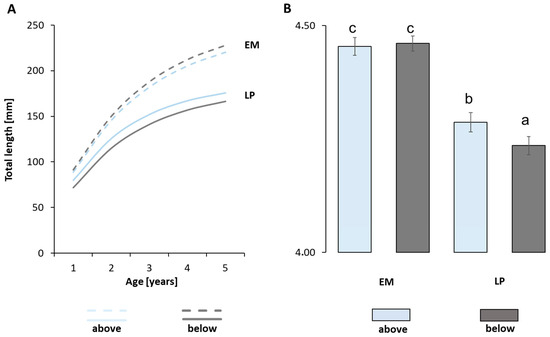 (A) Growth, based on von Bertalanffy function (VBGF), of the European brook lamprey (LP) and the Ukrainian brook lamprey (EM) in the unpolluted (above) and polluted (below) sections of the River Gać. (B) Index of growth performance (φ′). Homogeneous groups are marked with letters (Tukey’s HSD test).