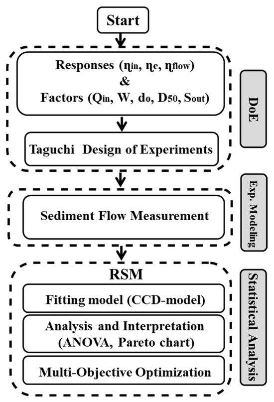 A combined Taguchi method and RSM approach [13,14,15,16], which offers an advantage over the Taguchi method, was applied for the design of experiments, analyzing the VSB efficiencies, and predicting the optimal hydraulic and geometric conditions of a typical VSB as a continuous settling system. A Taguchi design approach was employed for the design of experiments, enabling the introduction of factors with multiple levels of variation. Then, the RSM approach was utilized for analyzing the relationships between input factors (inlet flow rate, orifice diameter, sediment particle size, sill height, and outlet weir height) and the output responses (inlet canal efficiency, sediment removal efficiency and flow efficiency). Following this, multi-objective geometry and sediment flow optimization of a standard VSB were conducted, taking into account the identified factors and calculated responses.
