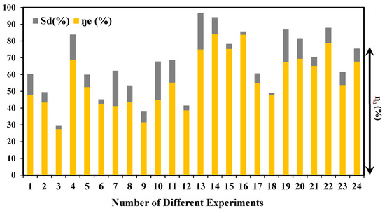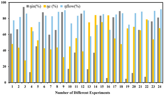 The value of , , and for the 24 different cases are presented in Figure 4. Based on Nikou et al. [12], was varied in the range 4.48–94.20%, and the third experiment with Qin = 22 L/s, D50 = 0.3625 mm, do = 0.1 m, Sout = 0.05 m, and W = 0.05 m had a higher efficiency regarding lower deposited sediment on the floor of the inlet canal. However, this case with 27.43% had a lower removal efficiency, as a large part of the inflow was led directly to the outlet canal. The next highest efficiency was for experiment 18 in which, and are 47.81% and 86.48%.