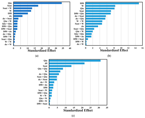 Figure 8 illustrates how specific parameters, determined through ANOVA and Pareto chart analysis, collectively influence . In Figure 8a,b, the direct influence of Qin mitigates separately the negative impact of do and Sout on by 30%. Three different interactions of parameters, including , , and , lead to a reduction in , with the first two interactions significantly decreasing efficiency (Figure 8c–e).