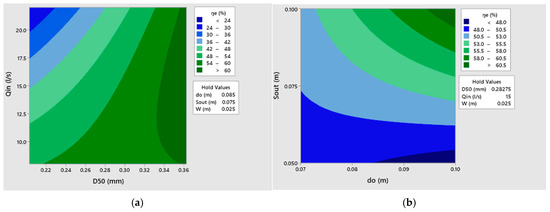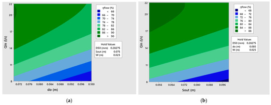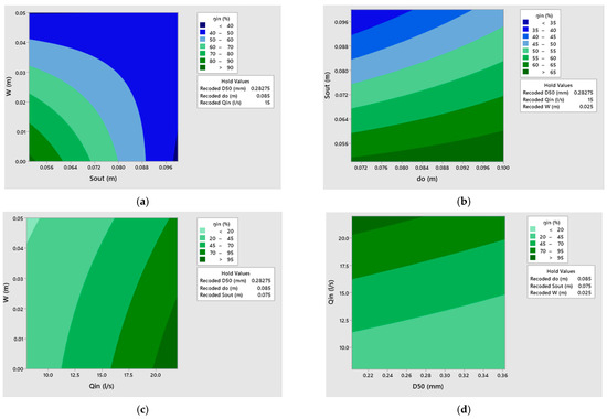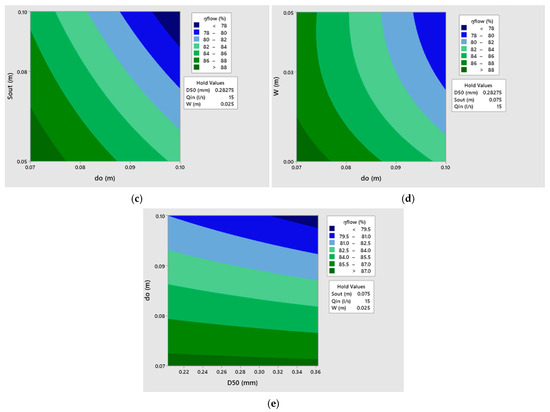 Figure 7 illustrates the combined effect of selected parameters that significantly influence sediment removal efficiency, as identified through ANOVA and Pareto chart analysis. Figure 7a highlights the reverse impact of Qin and the direct impact of D50 on , which can be enhanced through their interaction. This interaction results in a 1.5-fold increase in efficiency for higher flow rates. In Figure 7b, is directly related to Sout and inversely related to do, with only higher values of Sout exhibiting a positive interaction with do. It is observed that only lower values of Qin exhibit a positive interaction with do, leading to over a 20% increase in efficiency in Figure 7c. The individual variation of W and Sout, along with their interaction, at a lower weir height, positively influences efficiency, resulting in a twofold increase (Figure 7d). In Figure 7e, it is observed that increases with Sout, with this parameter exerting a significant influence in enhancing efficiency, particularly for higher Qin values.