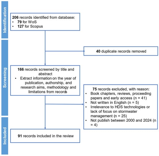 The systematic review exercise focuses on the role of HDS technology in stormwater control, covering the literature published between 2000 and 2024. The PRISMA framework was used to ensure the reporting quality and comprehensiveness. The literature was retrieved from Scopus and Web of Science using search terms such as “stormwater”, “pollutant”, “contaminant”, and “separation technologies”. The choice of Scopus and Web of Science for accessing peer-reviewed civil and environmental engineering literature is well-supported by their comprehensive coverage. A total of 206 papers were identified, with 40 duplicates removed. The other remaining papers were screened based on the criteria in Table 1. Only journal articles focusing on stormwater treatment were included, while conference proceedings, review articles, book chapters, and non-relevant publications were excluded. Only English-language journal articles were included to ensure consistency in data interpretation and align with the research scope, as English is the dominant language for scientific communication in civil and environmental engineering.