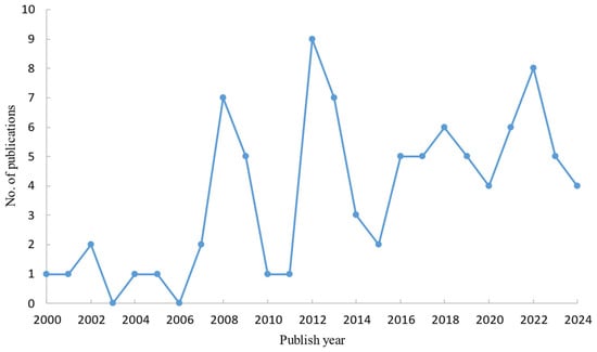 Trends in the annual publications related to stormwater treatment from January 2000 until June 2024 are shown in Figure 2. Publication numbers might vary due to factors such as changes in funding opportunities, technological developments, and changes in environmental policies and concerns. At first, publications grew steadily, with interest in the area apparently on the up. This increase led to the largest number of publications in 2012, which could be interpreted as a peak year with respect to activity or awareness towards stormwater. At this time, it was reported that since 2009, Philadelphia, USA had used a sustainable approach to reduce its impervious surfaces by one-third, with the replacement surfaces controlling approximately 35% of the urban runoff [37]. China also introduced the “Sponge Cities” concept in 2012, which aims to enhance urban resilience through innovative water management strategies [38]. The peak in publishing was followed by a decline until 2022, after which publications began to rise again. This renewed interest could relate to the increasing frequency of extreme weather events and severe urban flooding, which have induced governments and research institutions to highlight this area of research [39].