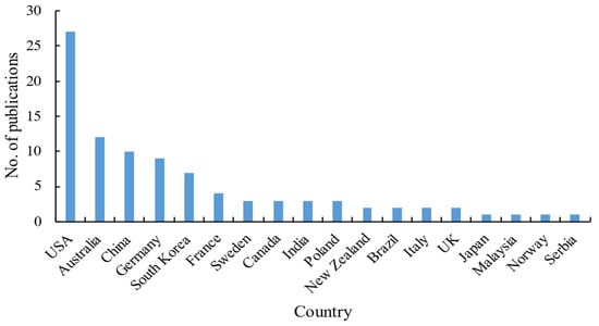 Figure 3 shows the global distribution of publications. The USA leads with 27 publications, indicating a strong research foundation and high attention to this area. Australia follows with 12 publications, and China and Germany are close behind with 10 and 9 publications, respectively, which relates to their specific environmental challenges and urbanization issues, demanding advanced rainwater management techniques. Other mid-ranking countries, such as South Korea, France, and several Nordic nations, also show notable research activity. Although smaller countries like New Zealand, Brazil, Italy, the UK, Japan, Malaysia, Norway, and Serbia have fewer publications, their research contributes significantly to the development of global stormwater treatment technologies and strategies, highlighting the diverse research efforts and potential for international collaboration among different countries in addressing climate change and urbanization challenges.