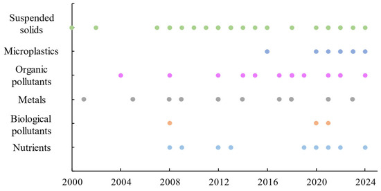 Figure 4 displays the focus on various pollutant types, as documented in scholarly works from 2000 to 2024. It illustrates that there has been a sustained and heightened interest in suspended solid particles throughout this period. Among the suspended particles, fine PM (<75 μm) accounted for the majority, followed by gravel-sized PM (>2000 μm) [55]. Organic pollutants and metals are also significant, albeit with a slightly lesser research focus than suspended solids [56,57,58,59]. The scrutiny of nutrients escalated in 2008, potentially caused by the increased use of fertilizers and the recognition of automotive and road maintenance products as their predominant sources [60,61]. Additionally, in urban landscapes where stormwater and sanitary sewage are channeled through combined sewer systems, the risk of system overload during substantial rain events is high [62]. It can result in overflows where untreated sewage and stormwater are discharged into the environment [53,63]. Thus, biological pollutants, including E. coli, have drawn considerable research attention from sewer flow [64]. The escalating usage of plastics has contributed to a substantial boost in microplastic research since 2020. Such particles are mostly found in industrial and commercial areas, with much lower levels in agricultural landscapes [65,66].