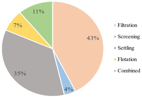 The distribution of publications by separation type is illustrated in Figure 6. Filtration-based stormwater separation techniques are most commonly featured, representing 43% of publications, indicating their widespread application in this emerging field, followed by settling, which accounts for 35%. Flotation is documented in 13% of the publications, showing it as a recognized, albeit less researched method compared to filtration or sedimentation. Screening is explored less frequently, appearing in 7% of publications. In the existing studies, 11% of publications focused on multi-mechanistic treatment devices, suggesting new directions for integrating diverse separation technologies to enhance pollutant removal from urban stormwater.