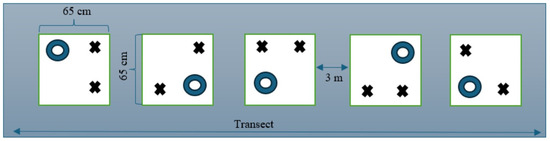 A schematic diagram showing the layout of the five measurement locations along each transect and the infiltration tests performed with the three methods. Green-outlined squares = rainfall simulation plots; black X = measurement via automated SSBI; blue circle = measurement via Saturo infiltrometer.