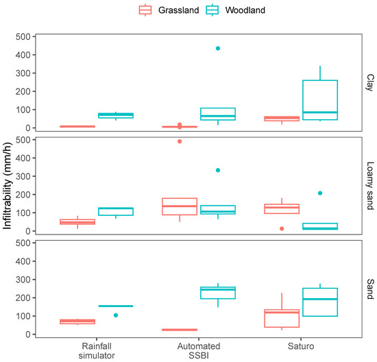 Box plots of infiltration capacity values for grassland and woodland zones obtained at the three sites via the three measurement methodologies.