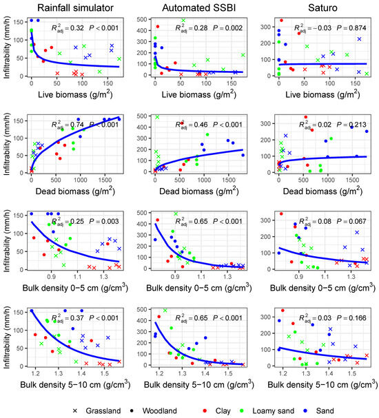 Correlations between infiltration capacity values (mm h−1) obtained with each method (rainfall simulation, automated SSBI, and Saturo) and influencing variables: live biomass and dead biomass (g m−2), and soil bulk density (g cm−3) in the 0 to 5 cm and 5 to 10 cm depth intervals. Note that the regression line, adjusted R2, and p-values are based on a log–log relationship, but the scales on both axes are presented in their original form for better visualization.