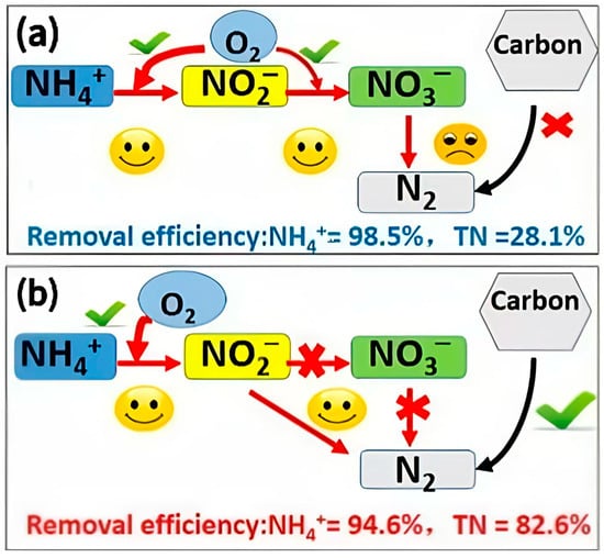 20]. And it has been reported in the literature that in terms of ammonia nitrogen removal, although the difference between short-cut nitrification–denitrification and nitrification–denitrification is very small, the removal rate of TN (total nitrogen = organic nitrogen content + inorganic nitrogen content in wastewater) has greatly improved. The removal rate is increased from 28.1% to 82.6%, and the higher the removal rate of TN (total nitrogen) is, the better the nitrogen removal of this process will be [