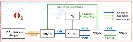 58]. Inorganic nitrogen can be converted into organic nitrogen and gaseous nitrogen through assimilation and dissimilation by HNADMs (heterotrophic nitrifying and aerobic denitrifying microorganisms) [