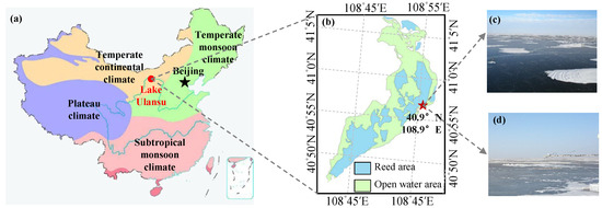 Lake Ulansu is located in Inner Mongolia, China at coordinates 40°36′–41°30′ N, 108°43′–108°70′ E. It covers an area of 306 km2, with maximum length and width of 35.4 km and 12.7 km, respectively. The water volume of the lake can reach 2.5–3 × 10 m3 [40], and the maximum and mean water depths are 2.5–3.0 and 1.0–1.5 m [18], respectively. Existing survey results show that the maximum ice thickness in winter ranges from 0.3 to 0.6 m [17,40,41]. This field study was conducted from 1 January to 9 March in 2017 in the eastern part of the lake (40.9° N, 108.9° E), approximately 200 m from the shore (Figure 1). The water depth at the observation point was 1.7 m, and the maximum ice thickness was 0.57 m, both of which fall within the average range for the Lake Ulansu during the winter and are representative.
