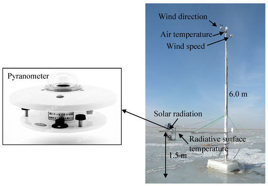 In situ measurements of solar radiation, atmospheric surface layer conditions (temperature, humidity, and wind speed and direction), and snow and ice thickness were conducted. Figure 2 illustrates the equipment used to measure solar radiation and atmospheric conditions, with further details provided in a previous study [39]. Solar radiation was measured using two pyranometers (TBQ-2, Jinzhou Sunshine Meteorological Technology Co., Ltd., Jinzhou, China, http://pvsb.china-nengyuan.com/member_product/78658.html, accessed on 1 January 2017.): one for incoming radiation and one for reflected radiation. The TBQ-2 measurement range was 300–3000 nm, with a sensor accuracy of 5%, and its manufacturing and calibration standards followed the guidelines specified in QX/T 55-2007.