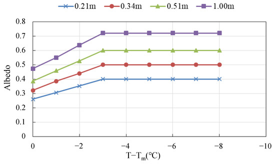 During the melting stage, the albedo of ice with a thickness of 1 m or more decreases linearly from 0.72 to 0.47. A similar linear decrease is applied to thinner ice (0.05 m ≤ ≤ 1 m) during the melting stage (Figure 4).