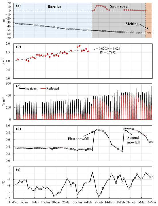 (a) Snow and ice thickness, (b) sediment content before snowfall, (c) incident and reflected solar radiation, (d) average albedo, and (e) daily average air temperature between 1 January and 6 March 2017.
