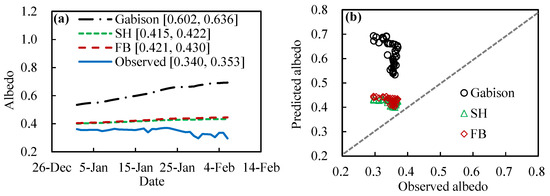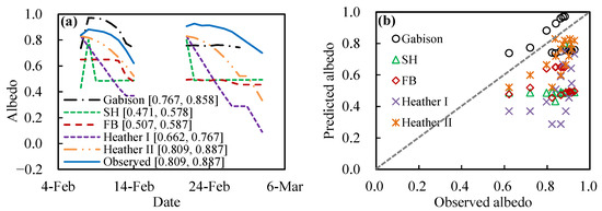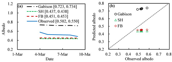 Albedo values observed and predicted by the Gabison, SH, and FB schemes during the snow melting stage (a), with 95% confidence intervals in brackets, and the comparison between predicted and observed albedo (b).