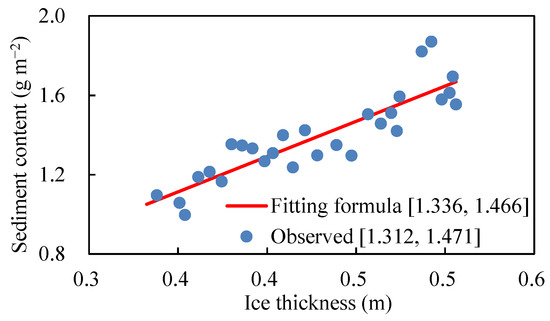 As shown in Figure 5, while the scheme predictions were relatively close to the measured values, they exhibited an opposite trend compared to the observed data. This discrepancy was primarily due to the sediment layer on the ice surface, which showed a clear increasing trend (Figure 5). To address this, the effect of surface sediment content on albedo was incorporated into the parameterization for the bare ice stage. Based on the error analysis in Table 2, the SH scheme was selected for optimization during this stage. In the SH scheme, albedo is calculated using ice thickness as the primary parameter. Given that changes in ice thickness closely align with variations in surface sediment content, a linear fit of ice thickness () and surface sediment content () was performed using the least squares method. The resulting formula is shown in Equation (10), with the fitting results presented in Figure 9.