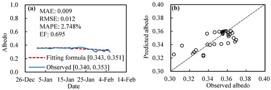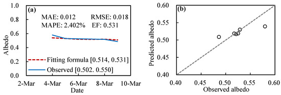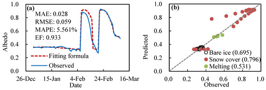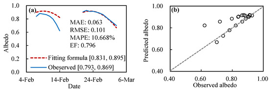 Observation and fitting results of the albedo during the melting stage (a), with 95% confidence intervals in brackets, and the predicted vs. observed albedo (b).