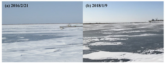 Uneven snow distribution on the lake ice surface during the winter 2015–2016 (a) and 2017–2018 (b).