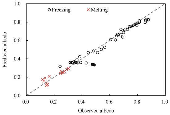 The albedo predicted by Equations (12)–(14), compared to the observed values, is shown in Figure 16, and the error analysis is presented in Table 6. For the predicted data from the freezing, melting, and entire stages, the MAE value was less than 0.05, with an average RMSE of 0.048 and MAPE of 10.793%. The EF for the freezing stage was 0.890, higher than the 0.826 for the melting stage. This difference was primarily due to observational limitations, because the data for the melting stage are mostly concentrated in the early stages of melting, which limits its ability to validate predictions for the later melting stages. After analyzing the data from both the freezing and melting stages, the overall EF reached 0.940, consistent with the results from the winter of 2016–2017.