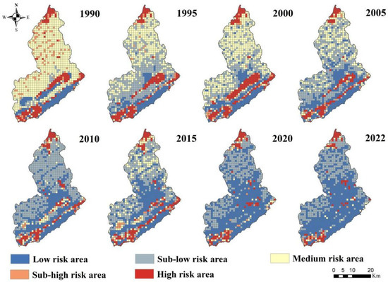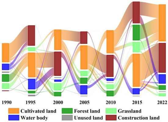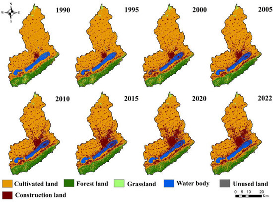Land use data for 1990–2022 was obtained from Wuhan University’s CLCD land cover classification dataset (https://zenodo.org/records/12779975, accessed on 12 February 2025), which has a spatial resolution of 30 m × 30 m [31]. According to the CLCD classification system, land within the study area was categorized into arable land, forest land, grassland, water bodies, unused land, and construction land (Figure 2). Annual precipitation and annual average temperature data were obtained from the China Meteorological Data Service Center (http://data.cma.cn, accessed on 12 February 2025), with a resolution of 1 km. The Population density, Gross Domestic Product (GDP) spatial distribution data, and nighttime light data were provided by the Resource and Environmental Science and Data Center of the Chinese Academy of Sciences (https://www.resdc.cn, accessed on 12 February 2025), also with a resolution of 1 km. The GIMMS-NDVI dataset is based on corrected and calibrated measurements from the Advanced Very High Resolution Radiometer (AVHRR), with a spatial resolution of 0.0833 degrees, covering the global range from 1982 to 2022. The maximum NDVI value is reported twice per month in a biweekly composite cycle (https://modis.gsfc.nasa.gov/, accessed on 12 February 2025). In this study, its spatial resolution was resampled to 1 km × 1 km, and the annual NDVI was extracted using the maximum value composite method in Matlab R2020a. Elevation data was downloaded from the Geospatial Data Cloud (http://www.gscloud.cn, accessed on 12 February 2025), while slope data was extracted from DEM data using ArcGIS10.8. Road and urban center data were obtained from the National Geographic Information Resource Directory Service System (https://www.webmap.cn, accessed on 12 February 2025), and the Euclidean distance tool in ArcGIS 10.8 was used to calculate the distance from each risk assessment unit to urban main roads and highways.