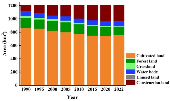 Between 1990 and 2022, significant changes occurred in the land use/cover types within the Yuncheng Salt Lake Wetland (Figure 3). Specifically, the area of cultivated land continuously decreased, from 861.58 km2 in 1990 to 755.94 km2 in 2022, marking a reduction of approximately 12.2%. The Grassland area also showed an general declining trend, shrinking to just 9.56 km2 by 2022, which represents only 31.4% of the grassland area in 1990. Meanwhile, the area designated for construction projects grew steadily, increasing from 88.15 km2 in 1990 to 242.61 km2 in 2022, a rise of about 175.2%. Woodlands remained relatively stable until 2020, after which they began to decrease, with a total reduction of approximately 25.41 km2 compared to 1990. The water body area showed a consistent decrease before 2000, with a loss of around 23.97 km2, but began to gradually increase after 2000, returning to levels similar to those of the early 1990s by 2022.