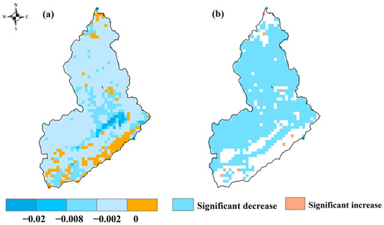 The interannual change rate of landscape ecological risk in Yuncheng Salt Lake (a) and significantly changed areas (b) from 1990 to 2022.