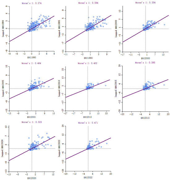 Moran’s I scatter plot of the ecological risk of salt lake wetland landscapes from 1990 to 2022.