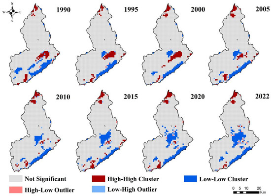 To reveal the horizontal scale ecological risk aggregation characteristics of the study area, the Geoda 1.20 software was used to perform global and local autocorrelation analyses of ecological risk at eight time points. The results show that the Moran’s I index of global autocorrelation for the ecological risk of the Yuncheng Salt Lake Wetland landscape is greater than 0 during the study period, indicating that the landscape ecological risk index is positively correlated spatially, with significant spatial aggregation and spatial differentiation (Figure 7). From the perspective of local autocorrelation aggregation characteristics (Figure 8), five aggregation features such as “High-High” and “High-Low” are present between the ecological risk indices of various risk zones. The “High-High” aggregation zones are mainly distributed in the northern and central parts of the salt lake area, as well as around urban areas and the northeastern part of the salt lake. From 1990 to 2022, the scope of this aggregation feature gradually decreased. The “Low-Low” aggregation zones are mainly distributed in the southeastern part of the Zhongtiao Mountain, areas that are mostly forest land with generally higher habitat quality. In recent years, the scope of the “Low-Low” aggregation zone has expanded to the central region, indicating an improvement in habitat quality in these areas. In summary, the spatial aggregation characteristics of landscape ecological risk on the horizontal scale of the Yuncheng Salt Lake Wetland show significant changes in high-value and low-value aggregation zones, while other aggregation features remain relatively unchanged.