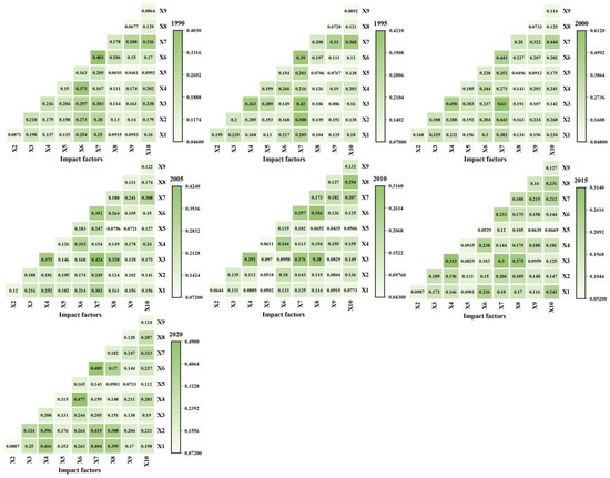 Using optimal parameters for geographic detectors, single-factor detection was conducted to assess the extent to which various factors contributed to ecological risk in the landscape during different periods from 1990 to 2020 (Table 4). The results revealed that elevation consistently had the highest explanatory power across the years, indicating that topography was the most influential factor on ecological risk in the Yuncheng Salt Lake Wetland. Mean annual temperature and population density were secondary factors, and due to the effects of global warming and urbanization, their impact on landscape ecological risk has intensified over time. Overall, environmental influences such as elevation, temperature, and slope were more significant than socio-economic factors in explaining ecological risk in the study region. While urban nighttime lights, proximity to urban main roads, and distance from highways had relatively weak impacts on ecological risk, their influence has gradually increased since 2000. Interaction detection was also performed to examine the impact of factor interactions on ecological risk in the landscape. The results demonstrated that interactions between factors had greater explanatory power than individual factors (Figure 9). From 1990 to 2005, the interactions of annual precipitation and NDVI with elevation contributed the most to ecological risk in the Yuncheng Salt Lake Wetland, with q-values generally exceeding 0.4. By 2020, the interactions of elevation and slope with GDP and population density reached their highest historical levels, indicating that the influence of socio-economic factors on ecological risk has continued to grow.