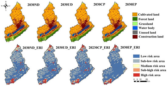 Contrast in 2020 and 2030 land use/land cover areas in the salt lake wetland under different scenarios (Unit: km2). Note: ND: natural development scenario; UD: urban development scenario; CP: cultivated land protection scenario; EP: ecological protection scenario; ERI: ecological risk index.