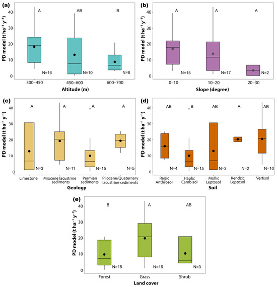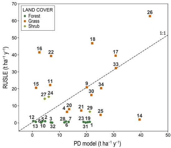 3.4. Soil Erosion Rates Estimated by the PD Model and Relationships with Physiographic Factors