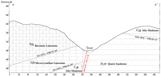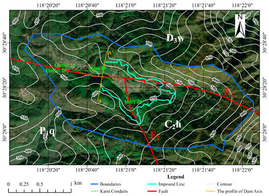 The scale of faults in the study area is relatively small, with faults F1 and F2 distributed in the upper reservoir area. As is shown in Figure 1, the F1 fault is located at the dam site and in the reservoir area, with a width of approximately 2.0 to 7.0 m, mainly composed of brecciated rock, mylonite, crushed siltstone, and fault clay. The F2 fault is distributed in the gully and reservoir area, with a width of about 0.5 to 1.0 m, primarily composed of tectonic rock, brecciated rock, and fragmental rock, with poor integrity of the rock mass on both the upper and lower sides.