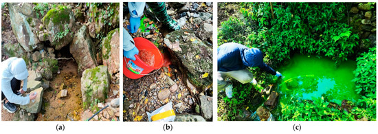The fieldwork in the site which (a) the field survey of karst conduits, (b) the release of tracers, and (c) water sampling at the monitoring points used in the trace test.