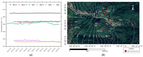 In the study area, six boreholes were established to monitor groundwater levels, influenced primarily by rainfall and lateral runoff. As is shown in Figure 4a, long-term data from observation wells indicate that groundwater level fluctuations during the monitoring period (12 December 2022 to 4 October 2023) ranged from 0.6 to 5.5 m. On the left bank, groundwater depth varied between 6.40 and 43.00 m, with fluctuations of 0.9 to 4.8 m during the observation interval (8 November 2022 to 4 October 2023). These fluctuations correspond with rainfall events, generally affecting groundwater levels on the same day or the following day, and a rapid decline often occurs post-rainfall due to runoff discharge.
