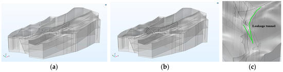 Two three-dimensional finite element models are used to finely characterize the study area, one representing the natural state and the other incorporating hydraulic structures, resulting in two distinct three-dimensional geological structure models. It also accurately depicts the main karst leakage pathways and the layout of hydraulic structures, as illustrated in Figure 4. Furthermore, in accordance with the leakage pathways revealed by on-site tracer tests, these pathways were represented in the model using line elements. During the model calculations, the leakage pathways were designated as line mass sources, with their flow rates determined based on the tracer test results, thereby facilitating the simulation of leakage pathways within the model. The leakage tunnel cylinders can be replaced by edges, which is more efficient for the meshing algorithm and requires less meshing. The advantage of this approach is that it provides accurate solutions compared to explicitly resolving details.