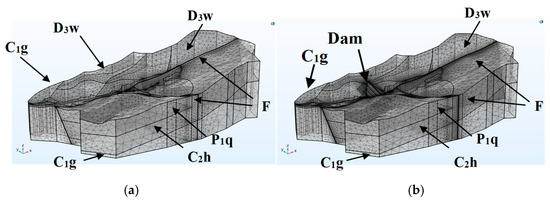 The mesh discretization of the three-dimensional geological model in this study features two distinct configurations: (a) the natural groundwater system at the research site and (b) the impounding scenario incorporating hydraulic structures, such as the dam and seepage control measures.