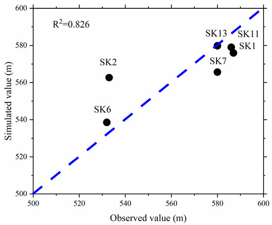 After repeatedly adjusting the permeability coefficients in each parameter zone, the simulated water levels from the boreholes, compared to the measured water levels, are presented in Figure 6. It is evident that the simulated water levels for the majority of boreholes closely align with the measured water levels. The calibrated permeability coefficients and precipitation infiltration velocity values are summarized in Table 2.