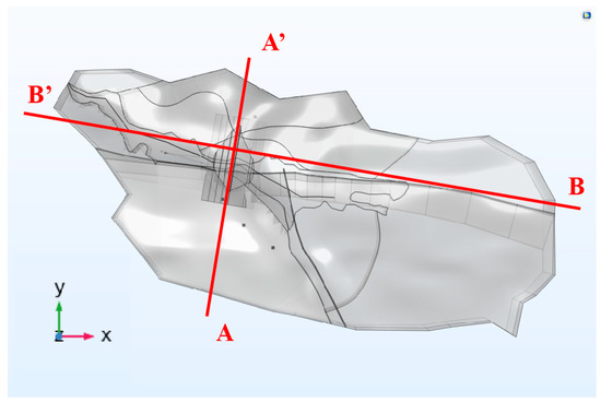 Selection of typical profile locations with two typical sections one is along the dam axis (A-A′) and the other is perpendicular to the dam axis (B-B′).