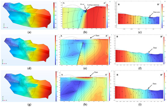 Distribution of the groundwater head of (a) natural condition in (b) dam axis and (c) perpendicular to the dam axis; (d) after Impoundment without seepage prevention in (e) dam axis and (f) perpendicular to the dam axis; (g) after Impoundment with seepage prevention in (h) dam axis and (i) perpendicular to the dam axis.