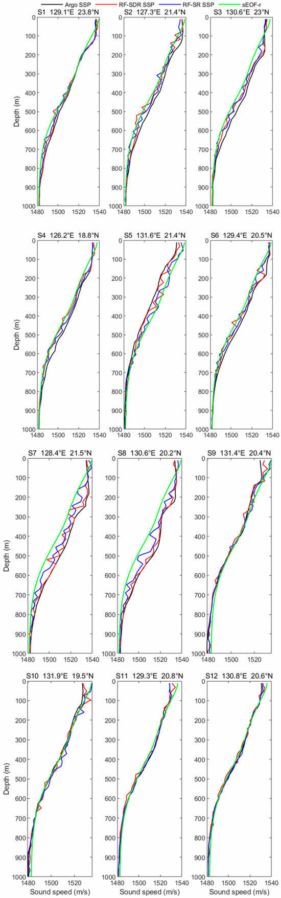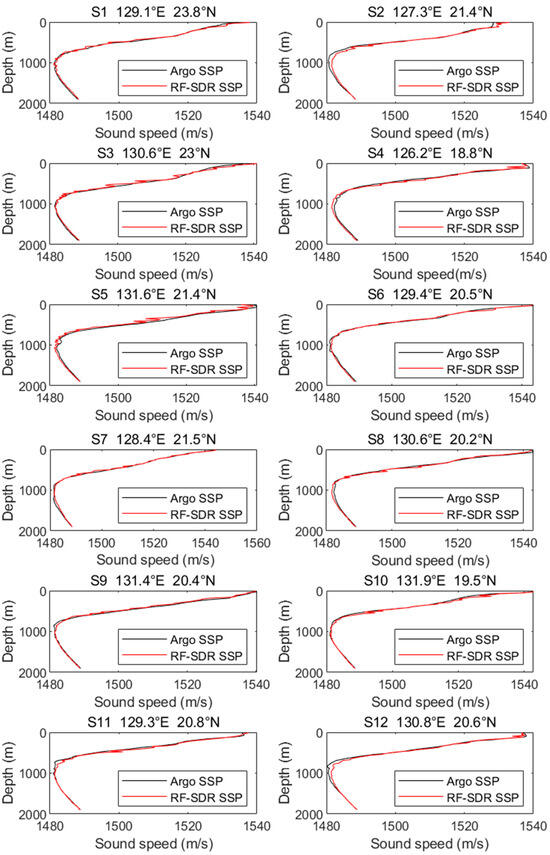 An evaluation was conducted using test samples to verify the accuracy of the RF-SDR model for sound speed reconstruction. The average RMSE of the 1419 samples was 1.51 m/s and the average MAE was 0.85 m/s. Figure 3 illustrates the reconstruction outcomes of the SSPs for 12 randomly chosen stations (S1–S12). The comparison of these results with the Argo SSPs demonstrated that the RF-SDR model effectively represented the sound speed distribution throughout various depth layers.