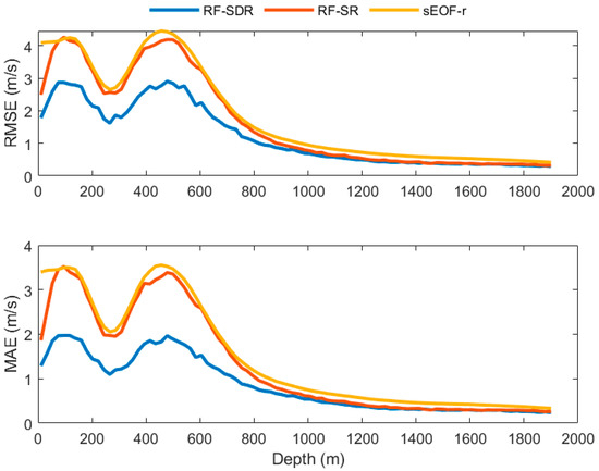 Given that the reconstruction differences below 1000 m were minimal, Figure 5 illustrates the reconstruction results for depths that exceeded 1000 m, which corresponded to the station locations depicted in Figure 3. The findings demonstrate that the RF-SDR model generated SSPs that were more consistent with the SSP from the Argo data, whereas the RF-SR and sEOF-r models exhibited a marginally lower accuracy in their results. Figure 6 presents a comparison of the RMSE and MAE across the three models at different depths. The findings indicate that although the sEOF-r and RF-SR models exhibited comparable reconstruction errors, with the sEOF-r being marginally higher, the RF-SDR model demonstrated a superior performance across all depth layers. This became especially evident at depths less than 800 m. The RF-SDR model demonstrated a reduction in the RMSE of more than 30% and a decrease in the MAE of over 40%.